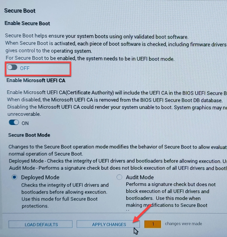 Secure Boot". Deaktivieren Sie die Option "Enable Secure Boot". Klicken Sie anschliessend auf "Apply Changes", um die vorgenommenen Änderungen zu speichern.